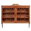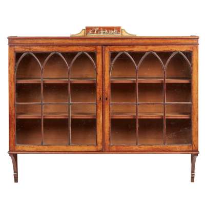 the cornice with a central table painted with a classical scene en grisaille, above a pair of astragal glazed doors enclosing adjustable shelves, with bracket supports