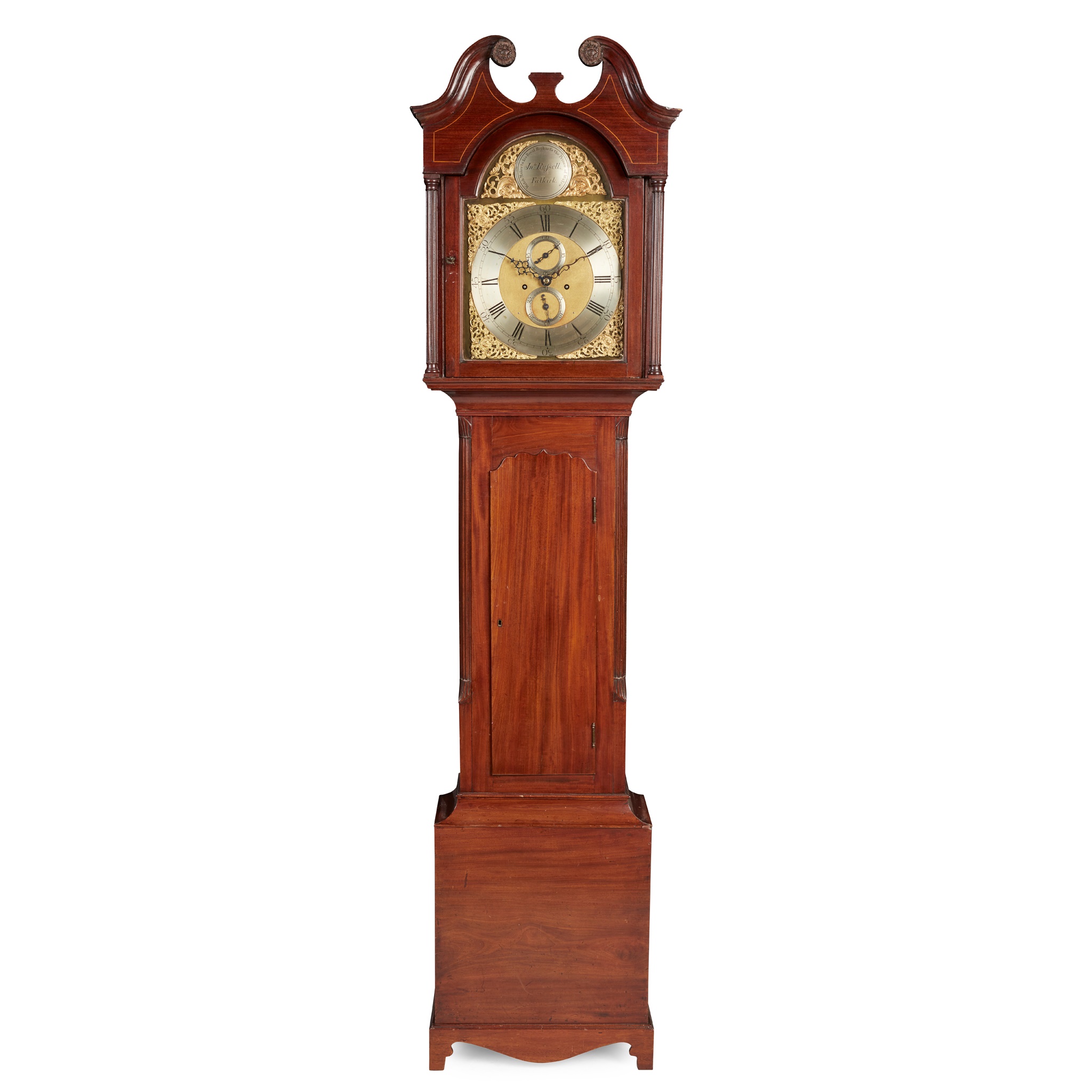 the hood with a swan neck pediment with embossed brass rosette roundels, enclosing a 13 inch gilt breakarch dial with silvered makers roundel to the arch signed 'Jn. Russell, Falkirk, Watch Maker to His Royal Highness The Prince of Wales', pierced gilt spandrels, with a silvered Roman numeral chapter with Arabic five minute markers, subsidiary seconds and calendar dials, the hood flanked by reeded Doric columns above a moulded arched trunk door flanked by reeded quarter columns, on a plain plinth base with bracket feet, the eight-day movement striking a bell