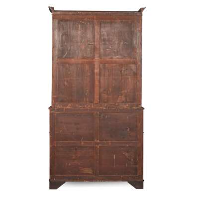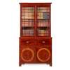 the moulded cornice above glazed mullioned doors outlined with ebony stringing enclosing adjustable shelves; the lower part with a secretaire drawer fitted with satinwood drawers and pigeon holes and a red leather writing surface, above a pair of circular panel doors opening to shelves and drawers, raised on bracket feet