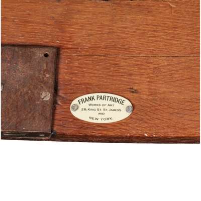 the bowfront tops with quarter fan medallions, ribbon-tied husk swags and foliate scrolls, within a palmette border, above friezes with parquetry inlay and wavy aprons, raised on line inlaid square tapered legs ending in brass caps and ball feet; bearing Frank Partridge St. James/ New York ivorine trade labels