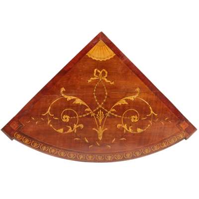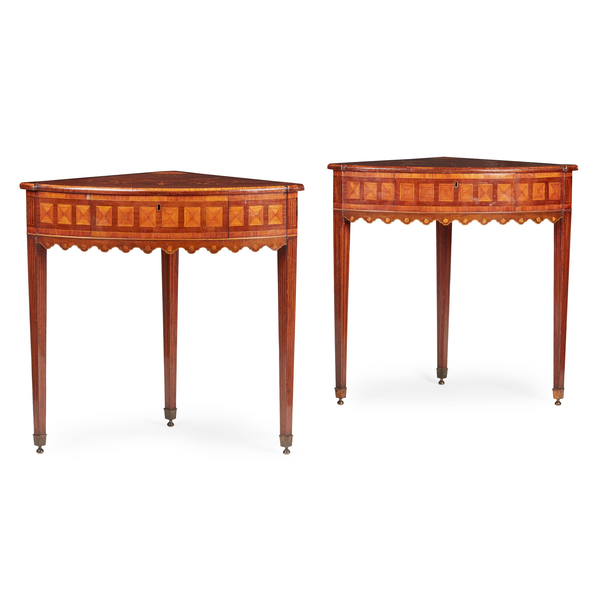 PAIR OF GEORGE III MAHOGANY, SATINWOOD, AND FRUITWOOD MARQUETRY CORNER TABLES, IN THE MANNER OF INCE AND MAYHEW