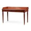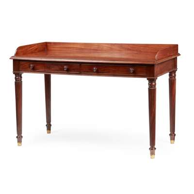 the rectangular top with a three-quarter gallery over two frieze drawers, raised on reeded legs ending in brass caps