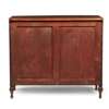 the top with a reeded edge over three long graduated drawers flanked by reeded pilasters, raised on turned legs