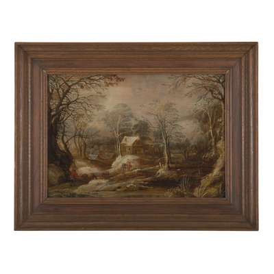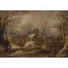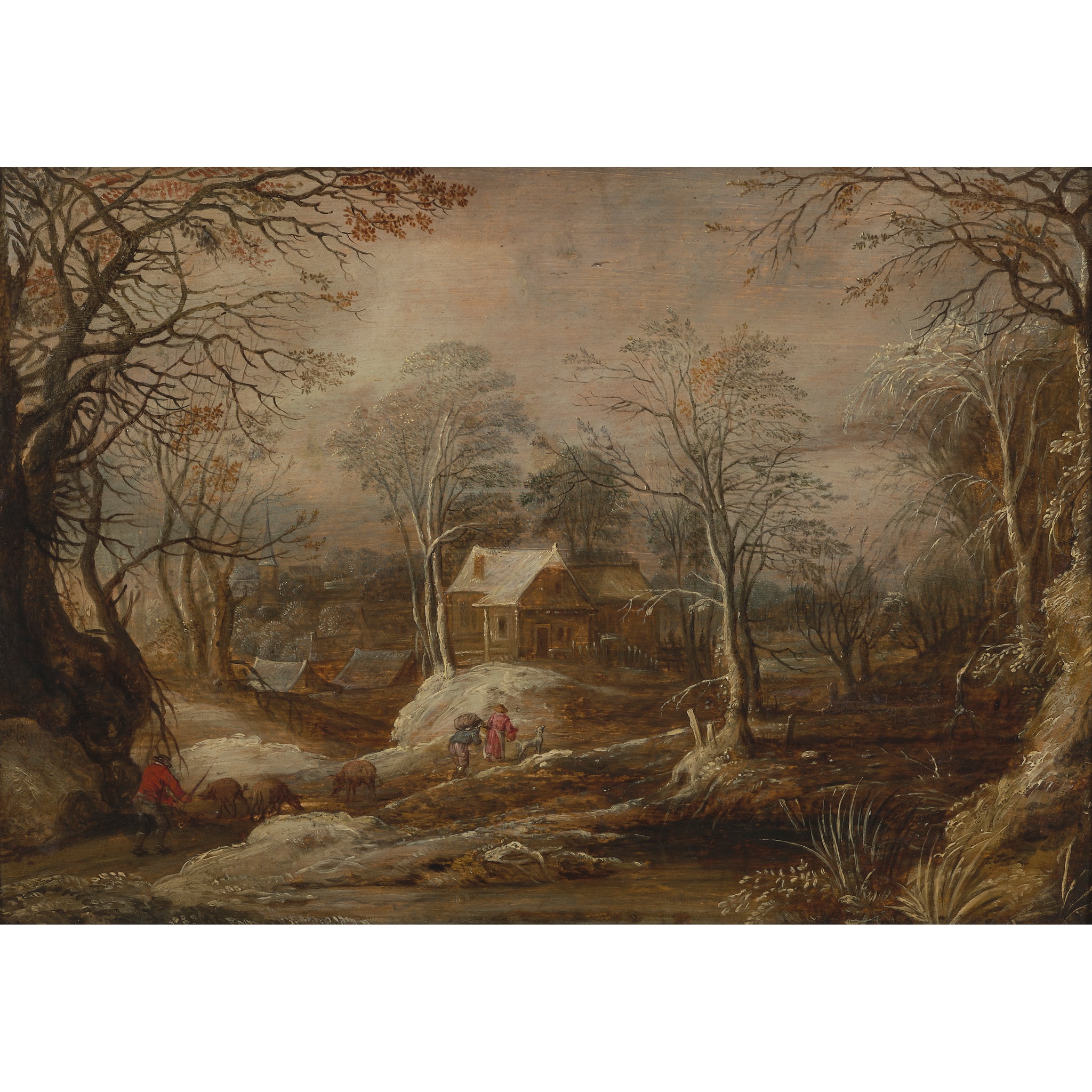 A WINTER LANDSCAPE WITH FIGURE DRIVING PIGS