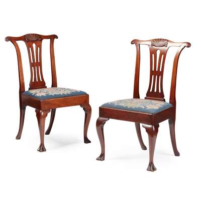 with shell carved top rails above pierced splats and drop-in seats with needlework covers, raised on cabriole legs ending in trifid feet