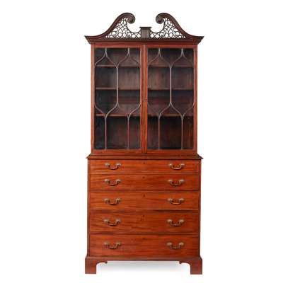 the swan neck pediment with carved roundels and fretwork, above a dentil moulded frieze and astragal glazed doors enclosing adjustable shelves; the lower part with a secretaire drawer fitted with pigeon holes and drawers, above three long graduated drawers, raised on bracket feet