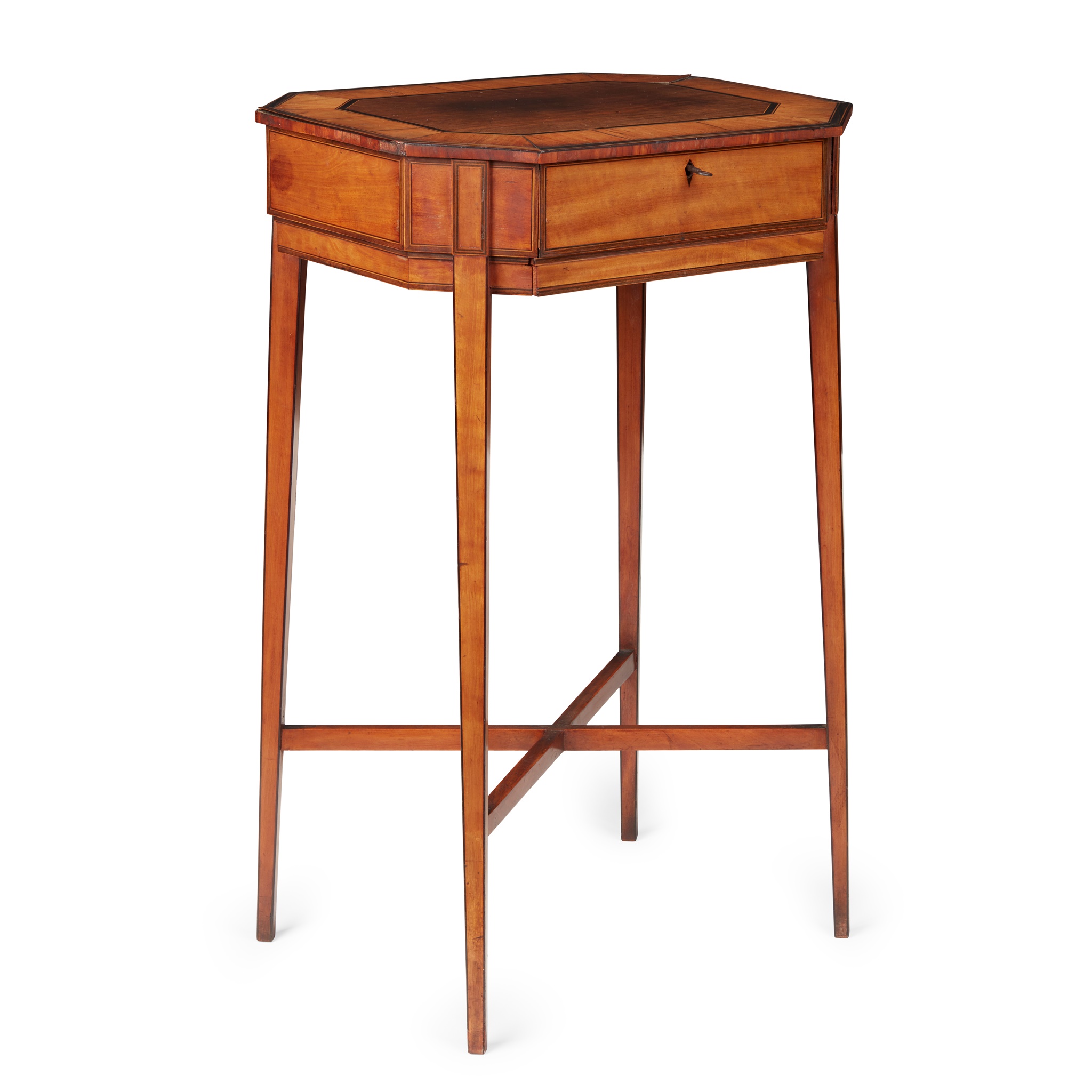 the octagonal crossbanded top above a frieze drawer and slide, raised on square tapered legs joined by an X stretcher