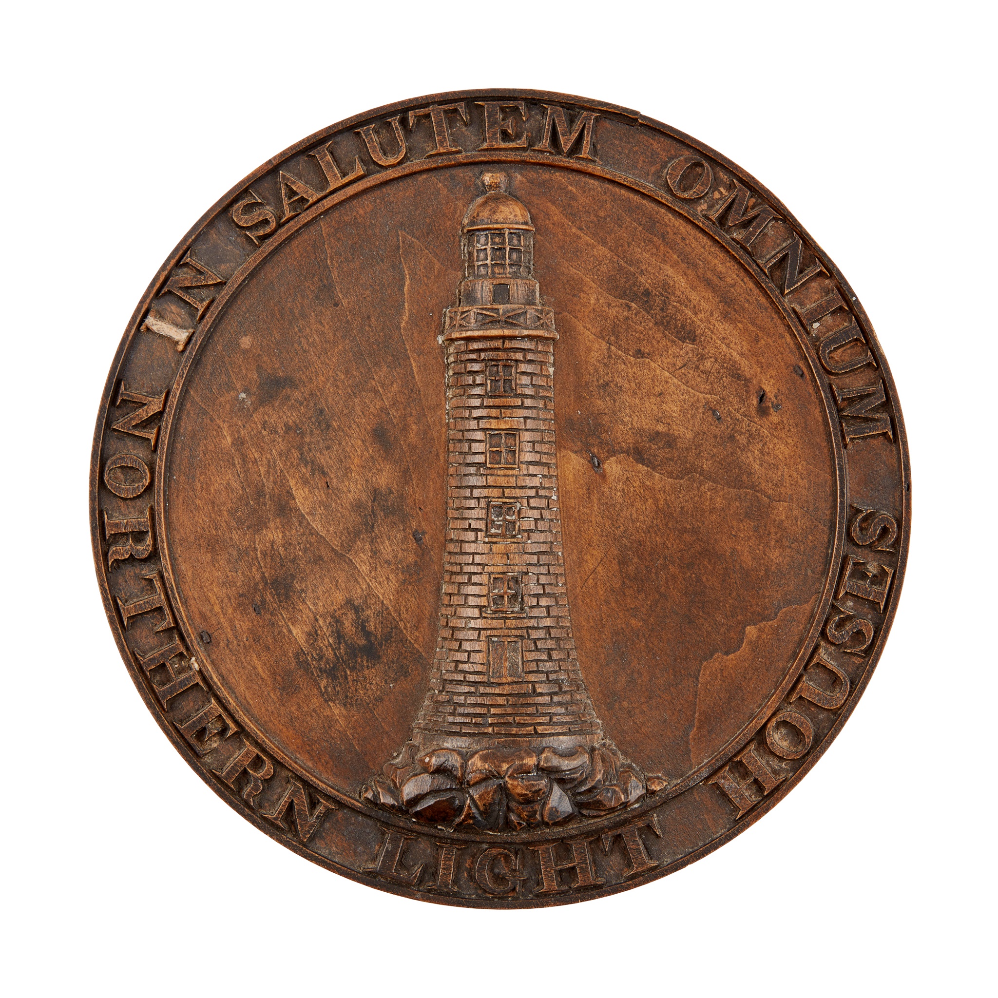applied to the centre with a relief carved lighthouse with waves below, within a border inscribed 'Northern Light House' and the with the motto of the board 'In Salutem Omnium' (meaning 'for the safety of all'); together with a VICTORIAN NORTHERN LIGHTHOUSE BOARD CARVED BOXWOOD CEREMONIAL MALLET, DATED 1874, both sides of the head with brass ring mount, both sides also relief carved with a roundel of a lighthouse with waves below, the collar inscribed ‘2nd Feb 1874, P.S.PHAROS, the twist handle decorated with Maltese crosses and beading