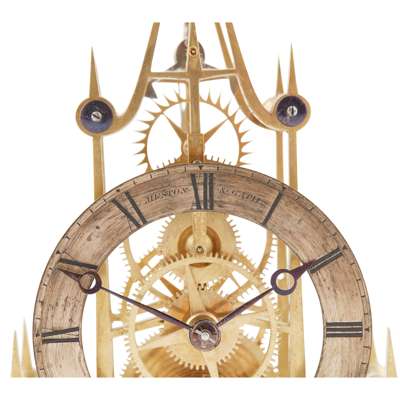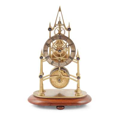 the silvered chapter ring with Roman numerals and signed 'Muston & Gath, Small St, Bristol', held in a Gothic spire skeleton frame with visible movement, on an oval mahogany base with bun feet, the single train chain fusée timepiece movement with anchor escapement