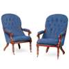 the curved button-upholstered backs above loose cushion seats flanked by open padded arms, raised on turned and tapered legs ending in brass caps and castors, with blue plush upholstery