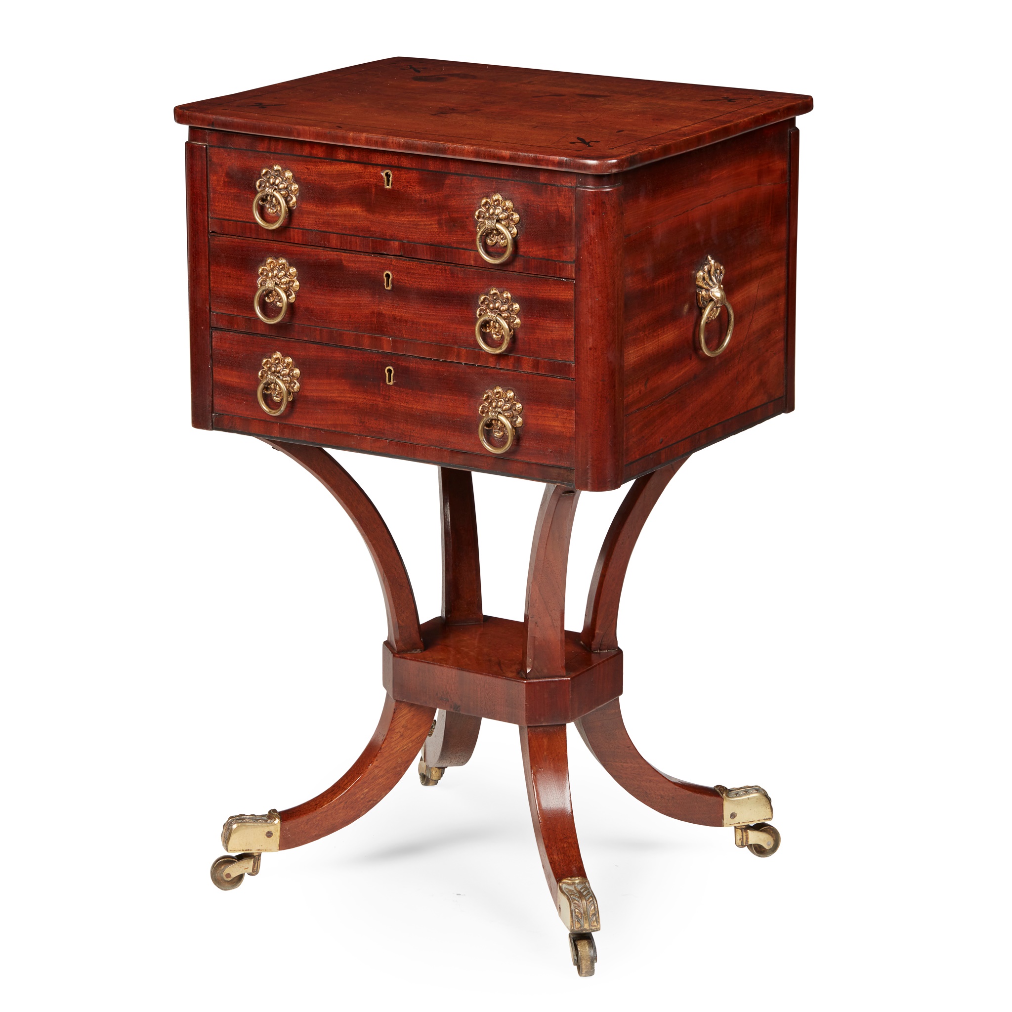 the rounded rectangular hinged top with ratchet support above a dummy drawer and two further drawers, with brass loop handles to the sides, raised on tall curved supports joined by an undertier and terminating in outswept legs with brass caps and castors