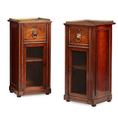 the square tops with pierced brass galleries above cupboard doors with brass lion mask handles and grille inserts, enclosing shelved interiors, on bun feet, all outlined with brass mounts