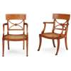 the tablet backs above curved X form stretchers and curved caned seats, flanked by open scrolled arms and raised on sabre legs
