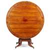 the circular tilt top bordered with foliate detail brass inlay, on a square tapered column and concave quadripartite platform with further brass inlay, raised on scroll legs ending in brass lion paw caps and castors