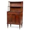 the superstructure with two tiers with wire grille sides, above a long frieze drawer and a pair of bead moulded cupboard doors, with brass handles to the sides, raised on bobbin-turned tapered legs ending in brass caps and castors