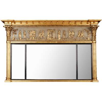 the inverted breakfront cornice with ball mounts above a frieze depicting a Classical tribute scene centred by a shrine to Diana, over three bevelled mirror plates flanked by Corinthian columns