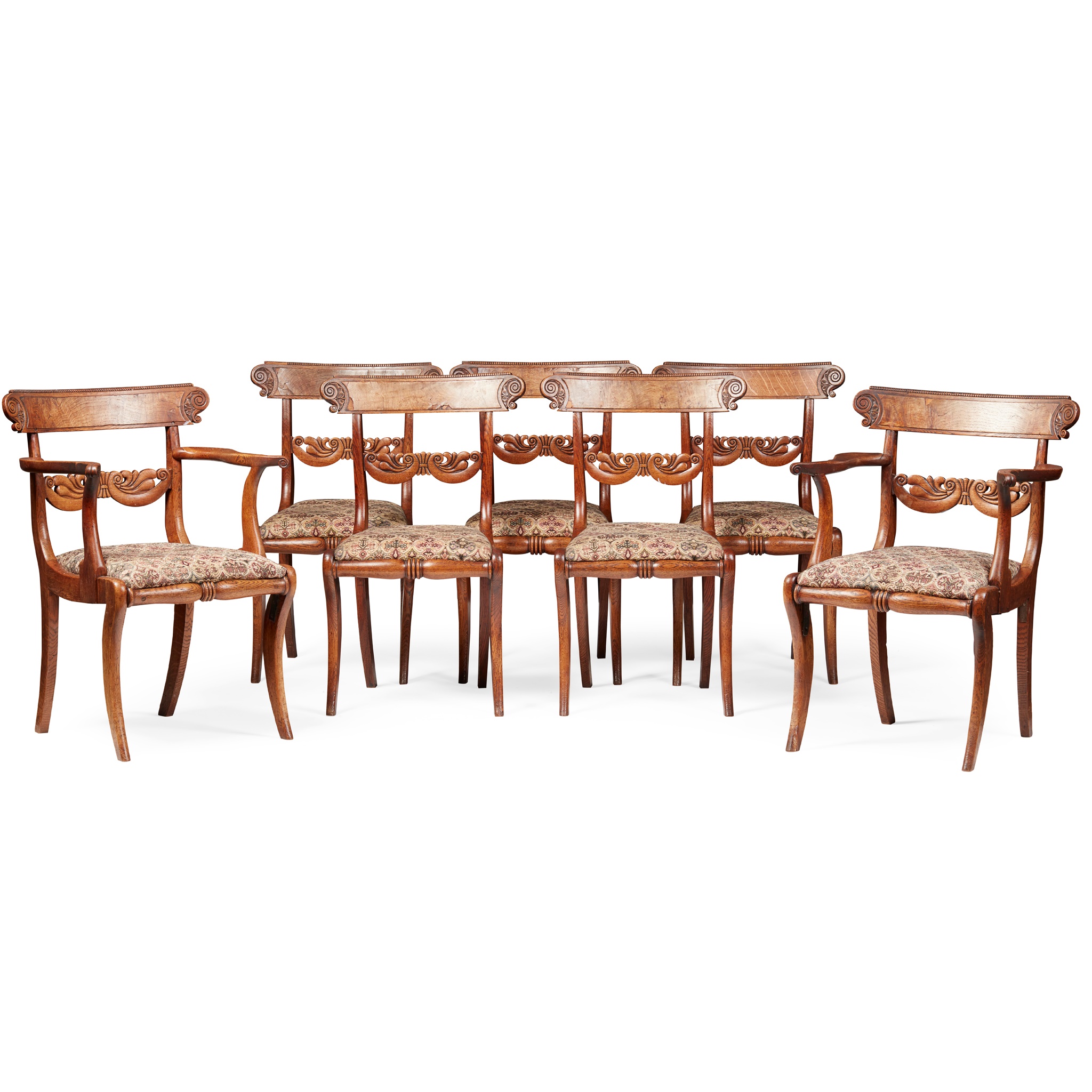 the scroll and bead-moulded back rails above foliate carved bars and drop-in seats with turned seat rails, raised on sabre legs, comprising five side chairs and a pair of armchairs