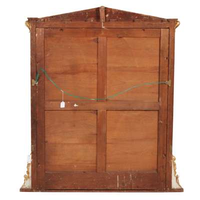 the rectangular mirror plate in a moulded architectural frame with laurel twined pilasters surmounted by a moulded pediment with cartouche and scrolling foliate details