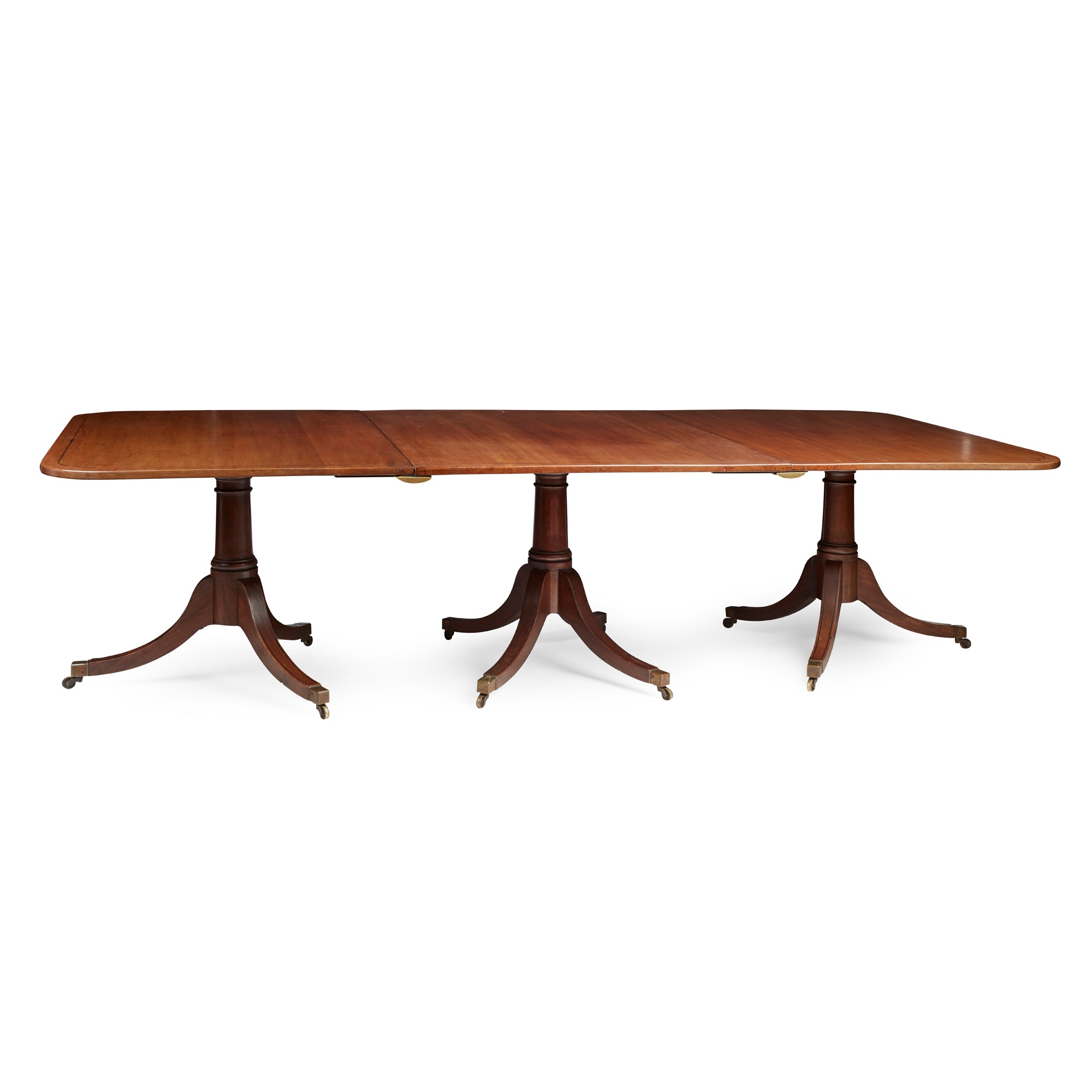 REGENCY STYLE MAHOGANY AND EBONY THREE PILLAR DINING TABLE