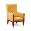 the square button-upholstered back above a stuffover seat and straight arms with carved patera facings, raised on square flute legs with brass caps and castors, covered in mustard yellow velvet