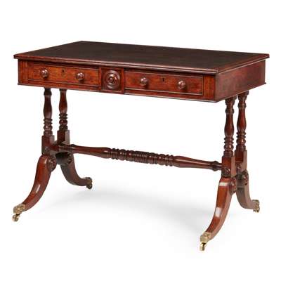 the rectangular top with a brown leather insert writing surface, above a pair of short frieze drawers with dummy drawers opposing, raised on turned end supports and scrolled trestle bases united by a turned stretcher, on sabre legs ending in brass caps and castors