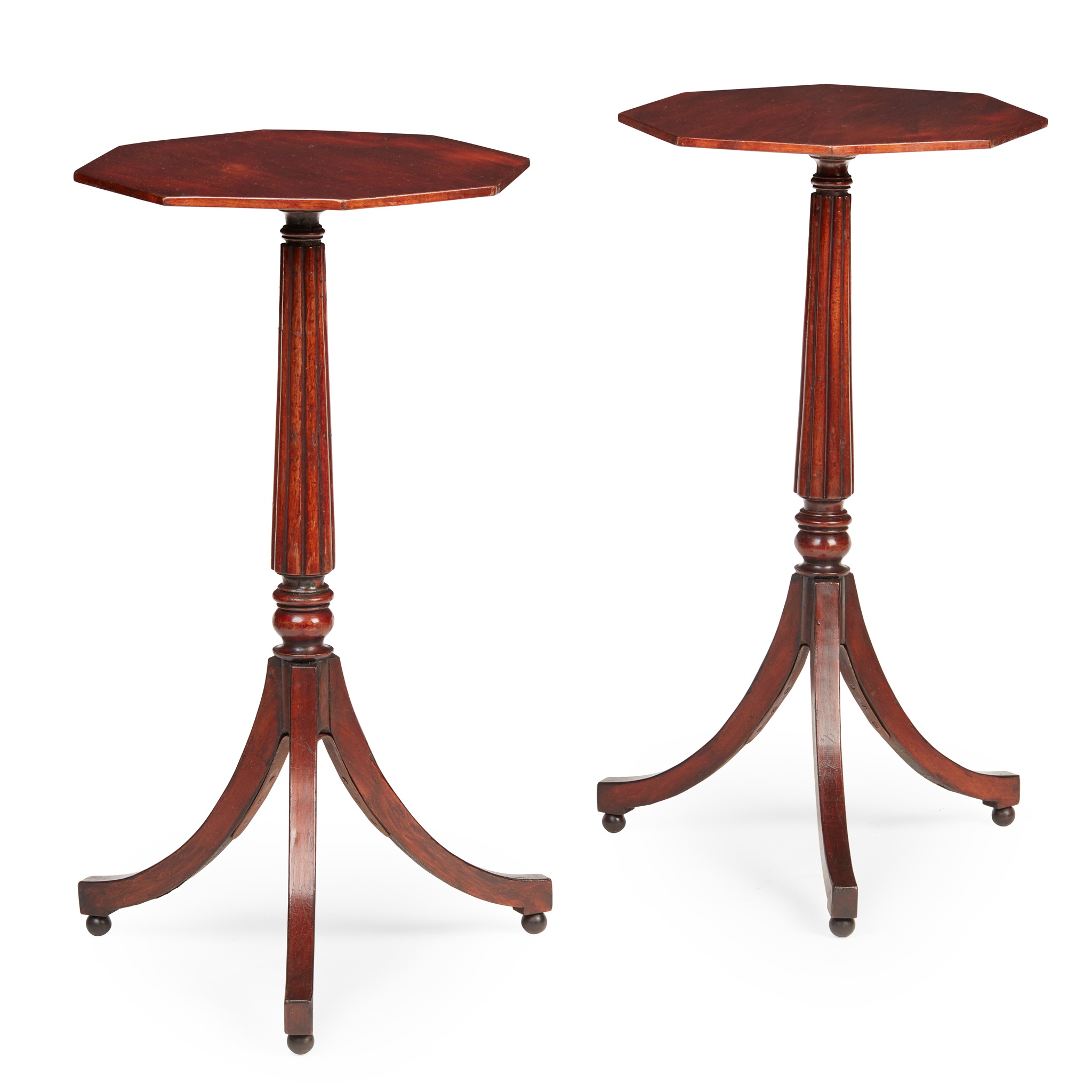the octagonal tops over a reeded and turned column, on tripod sabre legs with ball feet