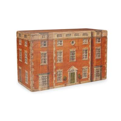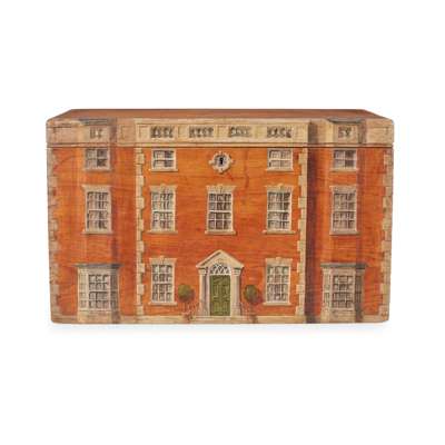 of rectangular form, painted on three sides to resemble a Georgian country house, with hinged cover, the lock mechanism impressed HOBBS & CO LONDON