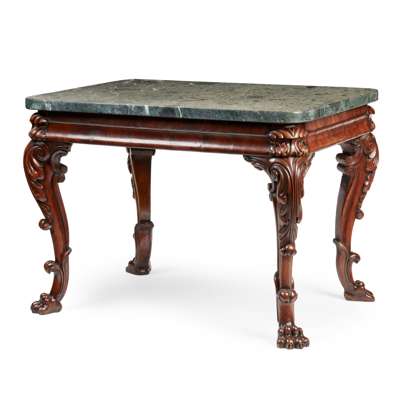 the rectangular verde antico marble top with rounded corners over a plain moulded frieze, raised on strongly carved legs with acanthus scrolls and ending in paw feet