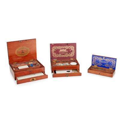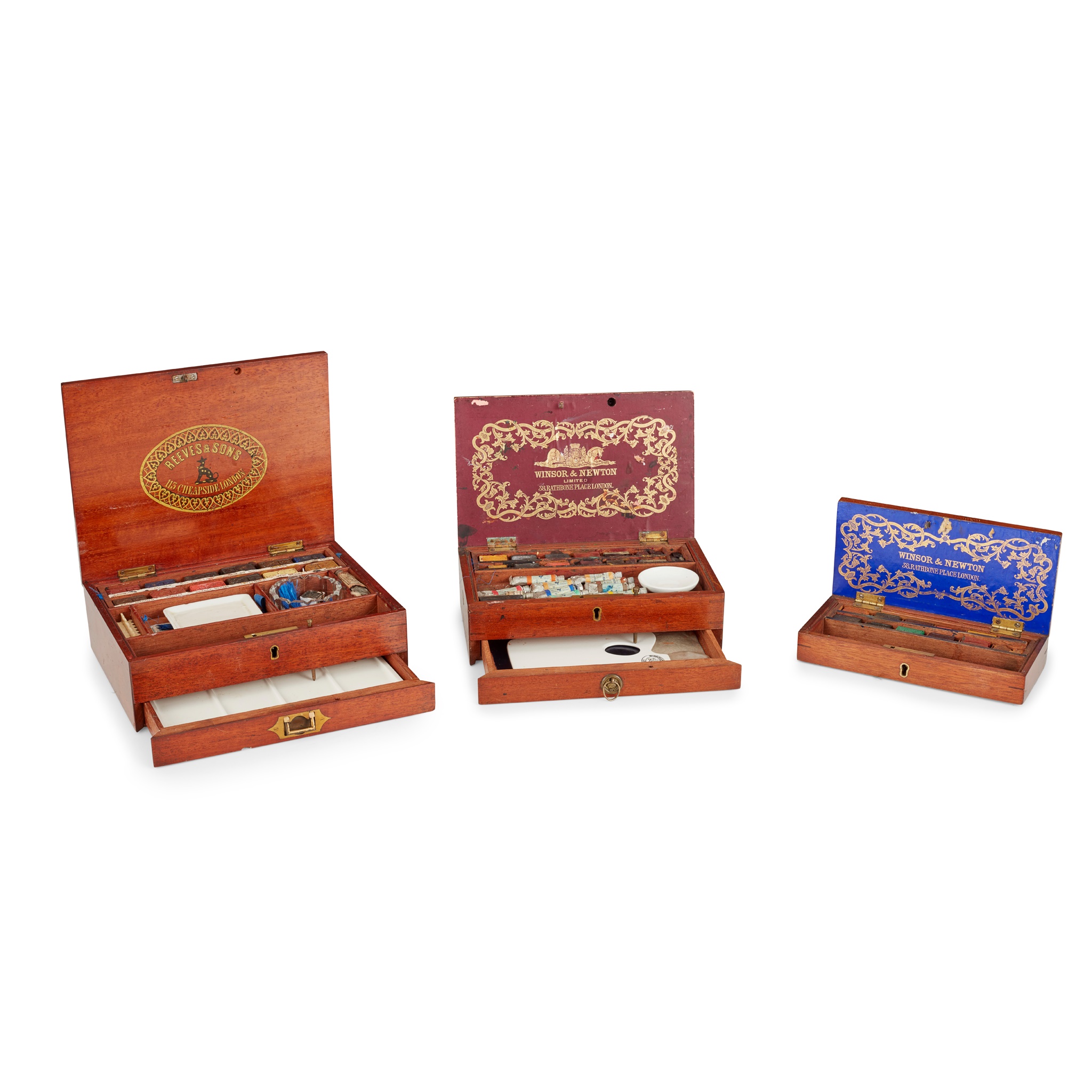 the largest a two tiered box with a fitted interior containing block paints, a glass water bowl, a paint mixing dish, and a brush stand, etc, with a key, the trade name Reeves & Sons, 113 Cheapside, London, printed in gilt to the interior of the lid, with a key, 22.8cm wide; a Winsor & Newton two tier box with fitted interior containing block paints, tube paints, a ceramic mixing bowl, and a ceramic artist's palette, paper maker's label in gilt to the interior of the lid, 21.7cm wide; and a small box complete with block paints, a brush and a key, blue and gilt paper maker's label to the interior of the lid, 19.3cm wide