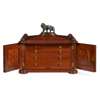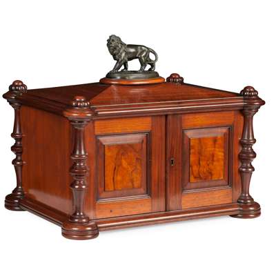 the sarcophagus shaped top surmounted by a patinated metal lion, above a pair of panel doors enclosing four graduated drawers, the corners with turned pilasters, on a moulded base and squat feet