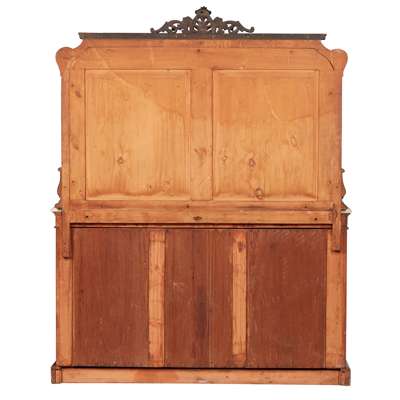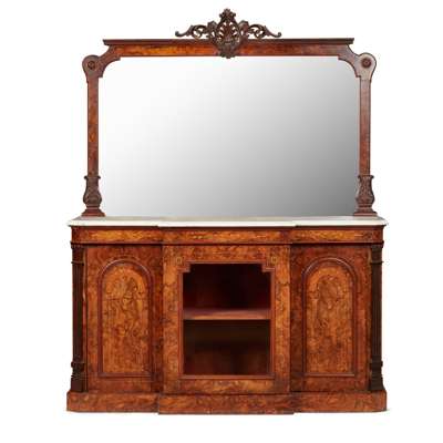 the shaped mirror in a palmette and acanthus carved frame above a white marble breakfront top, over a pair of glazed doors flanked by arch moulded doors flanked by fluted angles, on a plinth base