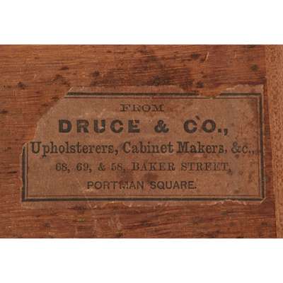 the top with a brown leather insert and bead and rosette carved edge, above a central frieze drawer flanked by short drawers, raised on banks of three graduated drawers on plinth bases, the sides and back panels with foliate carved panels and further rosettes, bearing a paper label 'FROM DRUCE & CO.,/ Upholsterers, Cabinet Makers, &c.,/ 68, 69, & 58 BAKER STREET/ PORTMAN SQUARE'