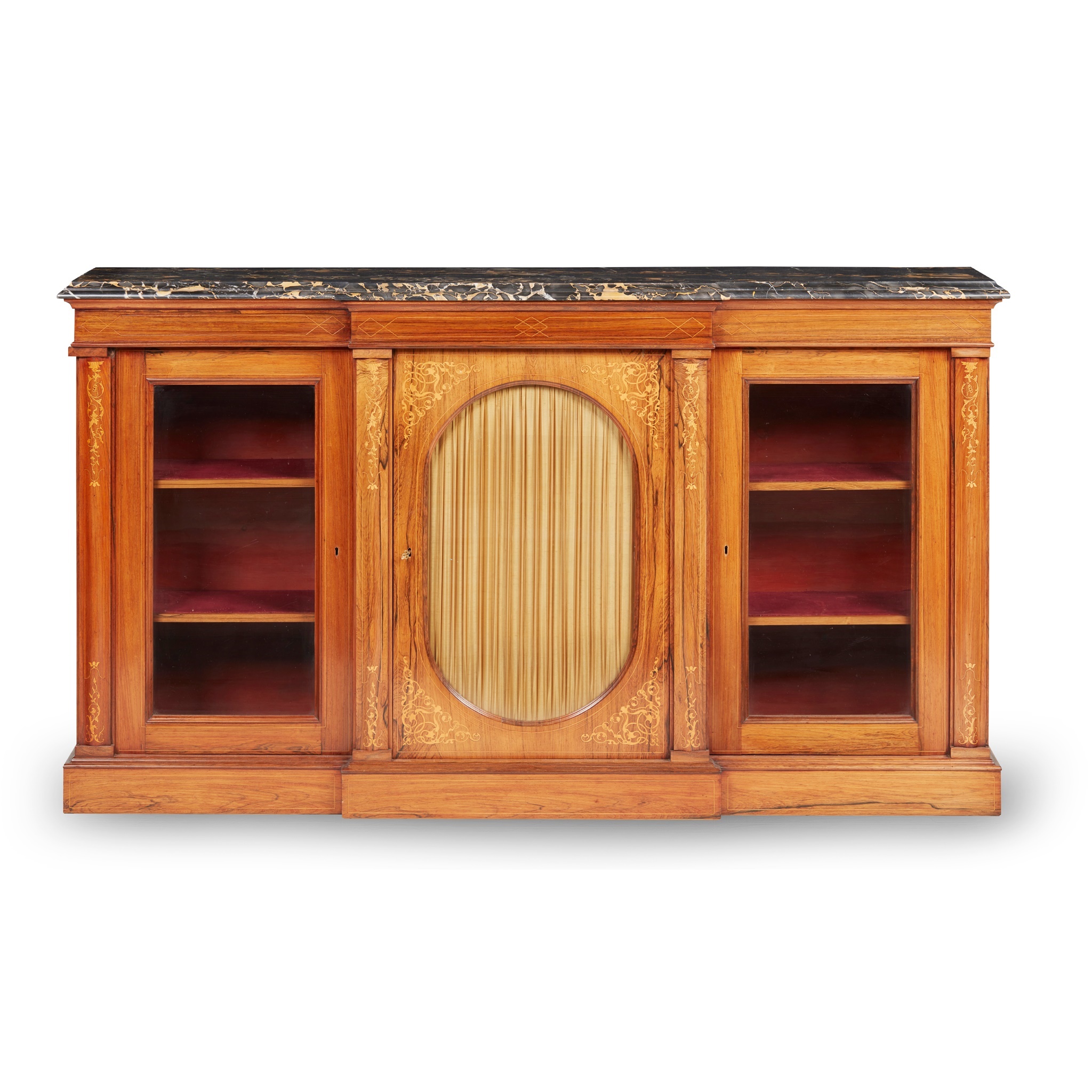 the nero portoro marble top of breakfront outline with a moulded edge, above a line inlaid frieze over a central oval glazed door with yellow pleated silk lining and marked at the corners with scrolling foliate inlay, flanked by further glazed cupboards enclosing shelves, on a conforming plinth base