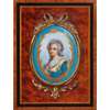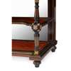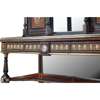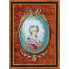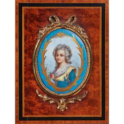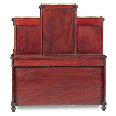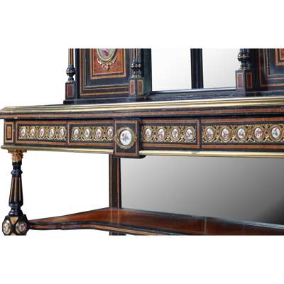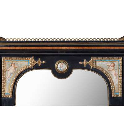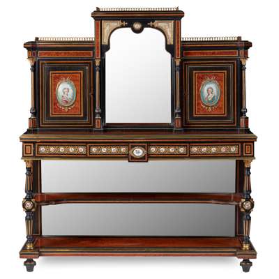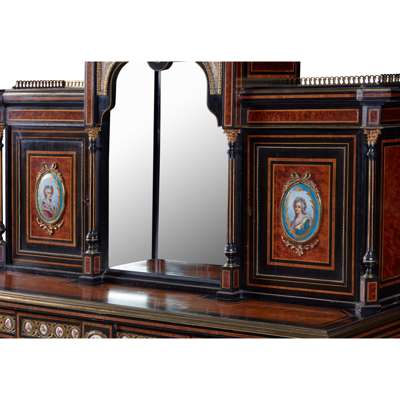 the breakfront top with a brass galleried central section with a mirrored recess flanked by doors with three-quarter brass galleries over panels mounted with Sèvres style porcelain plaques depicting French beauties against a blue celeste ground, all flanked and divided by fluted columns; the lower section with a moulded brass edge over three frieze drawers mounted with a rinceau frieze and further porcelain plaques, the centre drawer with a gilt tooled leather writing slope with easel support, above two mirror backed tiers flanked by fluted tapered supports, raised on toupie feet