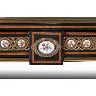 VICTORIAN AMBOYNA, EBONISED, PORCELAIN, AND GILT METAL MOUNTED SIDE CABINET