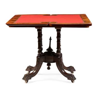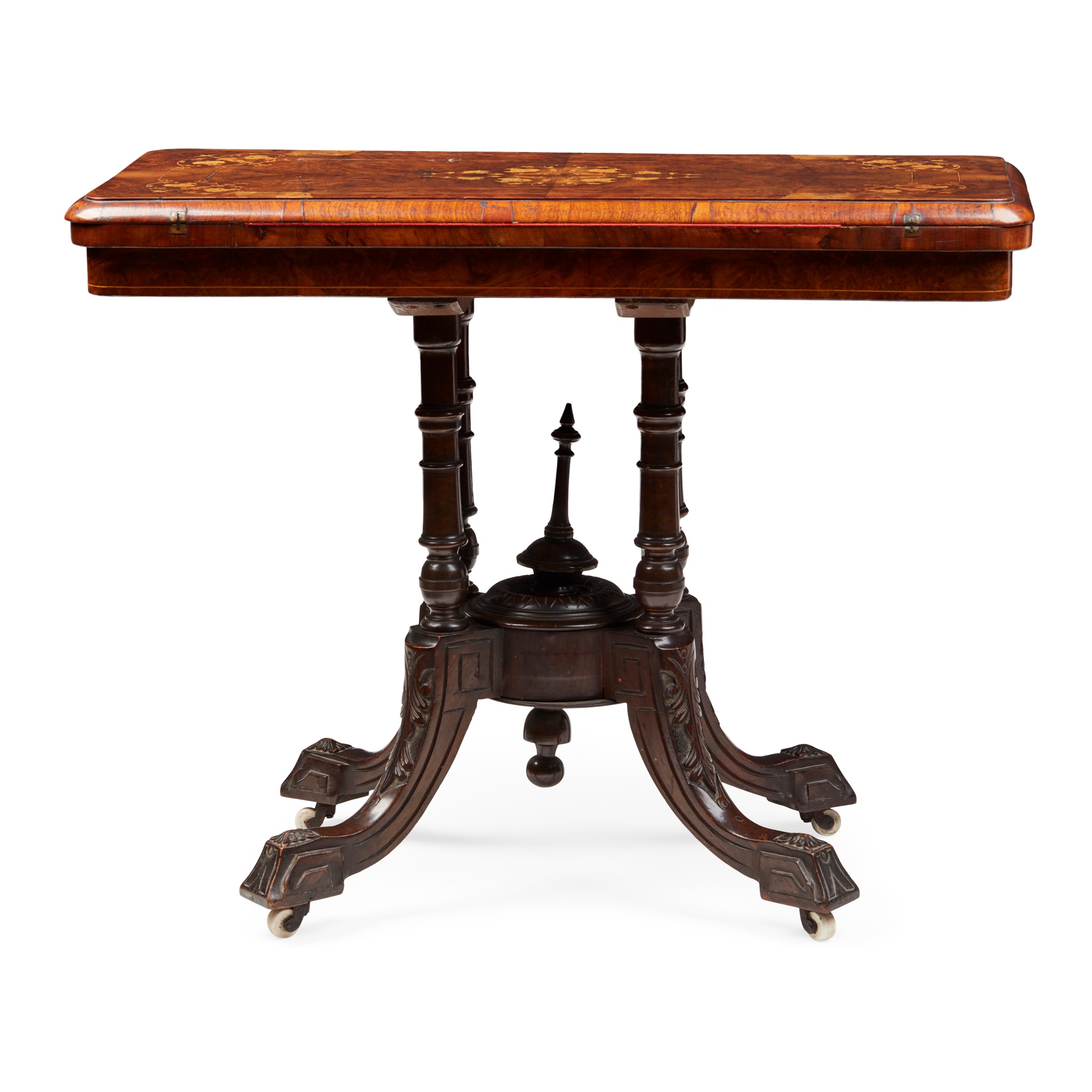 the fold-over top with a moulded edge, inlaid with stylised flowers and line inlay, opening on a pivot action to a red baize playing surface, raised on four ring-turned supports centred by a turned finial and raised on carved outswept legs with ceramic castors