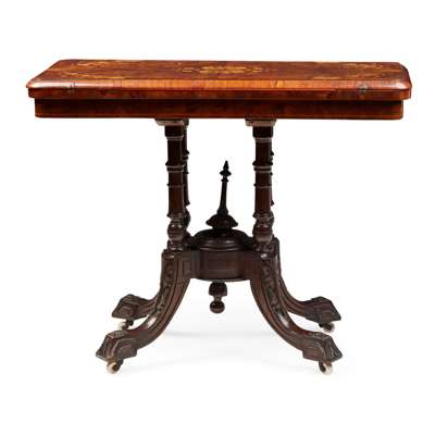 VICTORIAN WALNUT, EBONISED AND FRUITWOOD MARQUETRY CARD TABLE