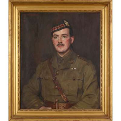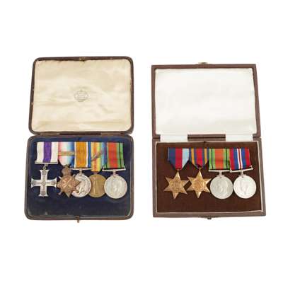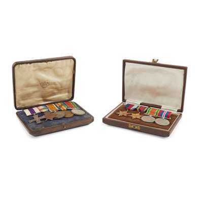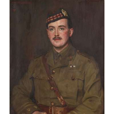of The King's Own Scottish Borderers, including a Military Cross, GR, reverse dated and initialled A.J.H-C 27.5.15, 1914 Star (Capt. A. J. Henryson-Caird. K.O Sco. Bord.), British War and Victory Medals, M.I.D oak leaf (Capt. A. J. Henryson-Caird) and Defence Medal 1939-45, inside a fitted leather case; together with A GROUP OF FOUR WWII MEDALS, awarded to his son Capt. Murray Alister Cooper James Henryson-Caird, including 1939-45 Star, Burma Star, Defence and War Medals, unnamed as issued, inside a fitted leather case; together with a HALF LENGTH PORTRAIT OF MAJOR ALISTER JAMES HENRYSON-CAIRD, oil on canvas, signed with a monogram and dated 1915, inscribed, 76cm x 63.5cm (30in x 25in)