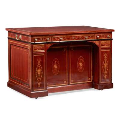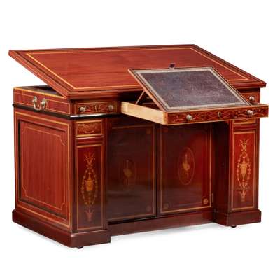 LATE VICTORIAN MAHOGANY, SATINWOOD, AND GONCALO ALVES MARQUETRY ARCHITECT'S DESK, BY EDWARDS & ROBERTS