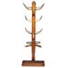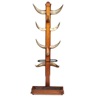 the oak square support with five pairs of graduated horn hooks, a black metal umbrella rail below, on a rectangular base with a tray insert
