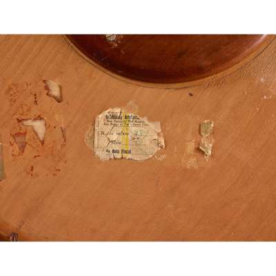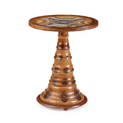 the circular top with an arrangement of butterfly and moth wings under glass, on a turned tapering column ending in a round base, remnants of an old trade label