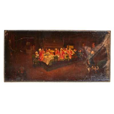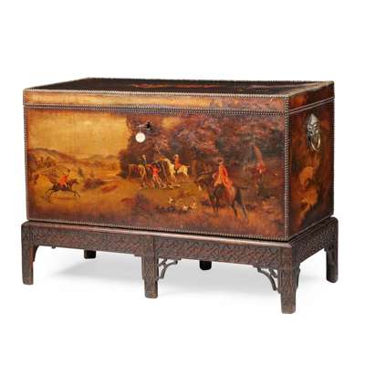 the hinged top painted with a scene of a gentlemen toasting at a hunt banquet, the front and sides painted with a continuous hunt scene with mounted hunters and dogs in a landscape, all outlined with close nail trim and brass mask handles to the sides; on a stained mahogany stand in the Chinese Chippendale style
