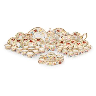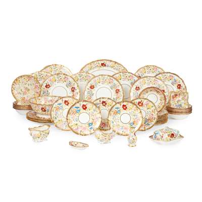 with printed and painted decoration of wide mixed flower borders within scallop edged gilt rims, comprising: fourteen dinner plates, 27cm diam; fifteen salad plates, 20.5cm diam; five large side plates, 17.5cm diam; nine smaller side plates, 15.5cm diam; twelve bowls, 17.5cm diam; eighteen small saucers; thirteen coffee cups; eleven tea saucers; ten tea cups; a large teapot; a smaller teapot; a coffee pot; large jug; cream jug; sugar bowl; preserve pot and cover; butter dish and cover; salt cellar; a footed bowl, 25cm diam; a strawberry basket incorporating a cream jug and sugar bowl; twin handled sandwich plate; round cake plate; oval serving dish, 37.5cm wide; a scallop shell moulded dish; a small square bon bon dish; and a small twin handled trinket dish; with various factory marks, some pieces with Jenner's retailers mark, pattern 13166