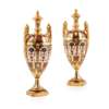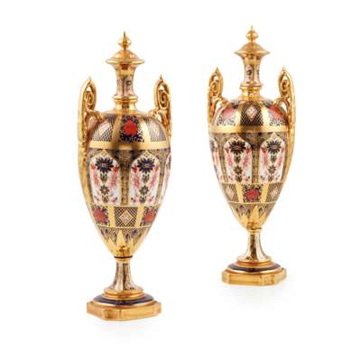 PAIR OF ROYAL CROWN DERBY IMARI TWIN HANDLED URNS AND COVERS