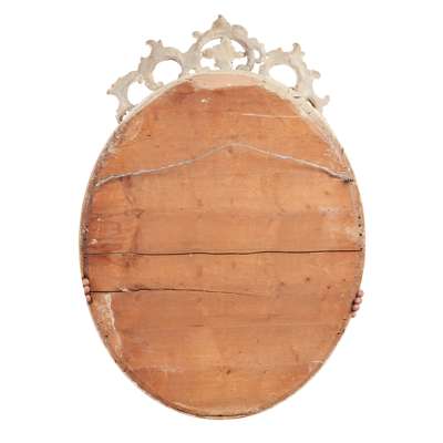 the sectioned oval mirror plate in a carved giltwood frame and borders, surmounted by open C scrolls and foliate cresting