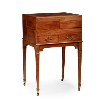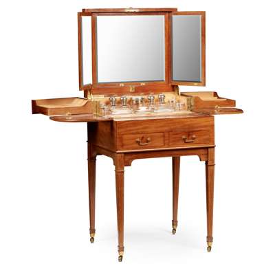 in the Georgian style, the hinged top opening to reveal a triple mirror and swing-out trays and glazed shelves, fitted with cream velvet inserts and a partial set of silver and ivory mounted dressing items, bearing retailer's ivory label FINNEGAN'S/ NEW BOND S.W., Rd No. 541493, the silver hallmarked George Betjemann & Sons, London, 1908