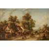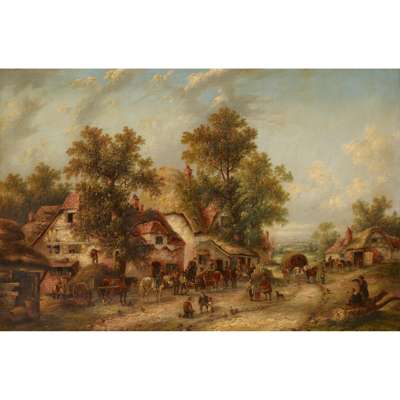 A BUSY MARKET SCENE WITH FIGURES AND HORSEMEN