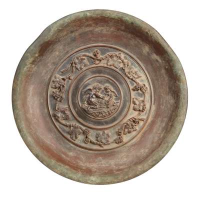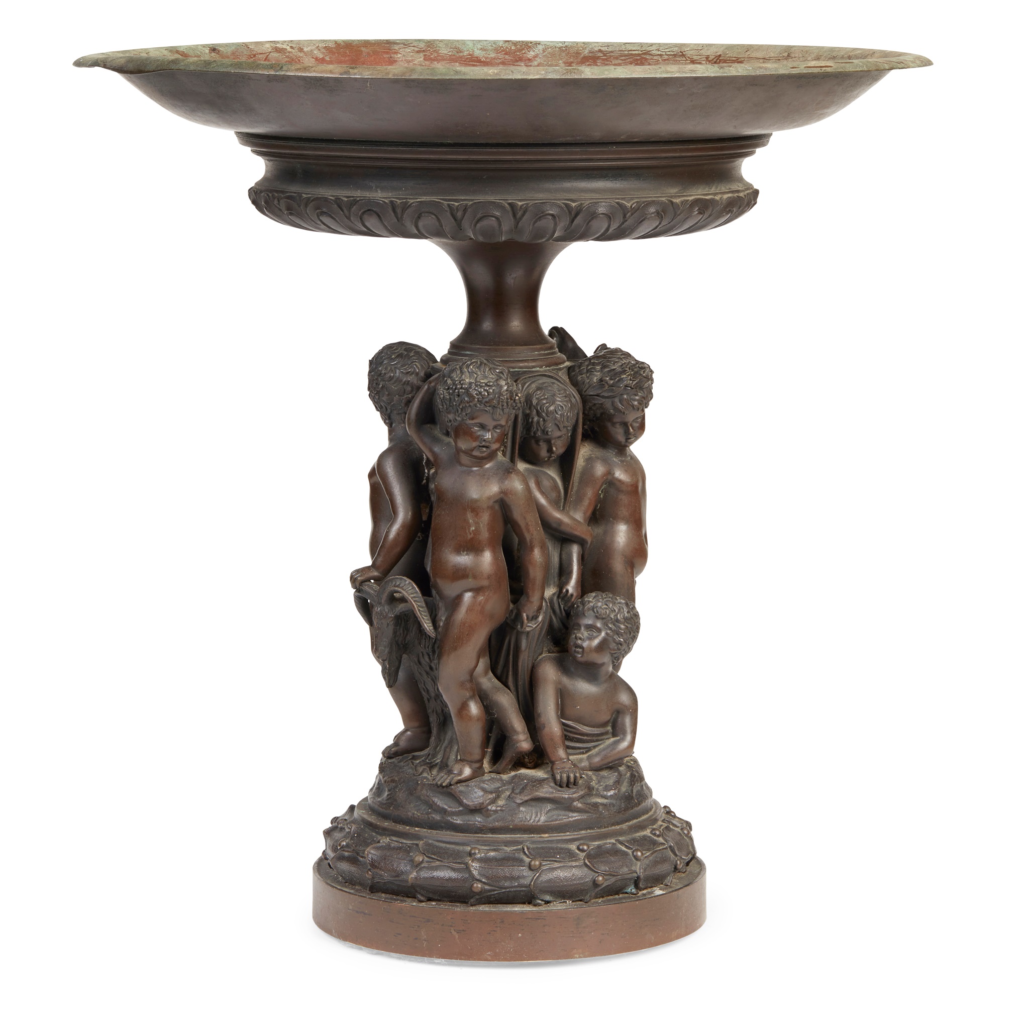 the basin cast in relief with putti and fruiting vines, supported on a column of bacchic infants and a goat with a laurel garland border
