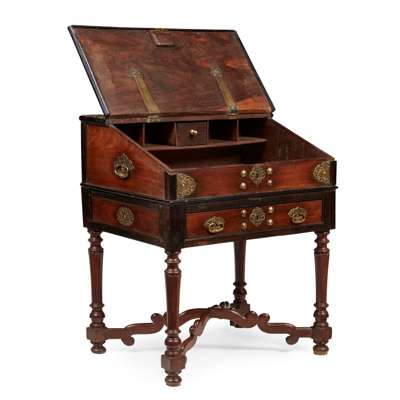 the slant top opening to a fitted interior, above a long frieze drawer to the base, raised on turned and tapered legs joined by scrolling X stretchers, with large pierced brass corner mounts, hinges, handles and bosses