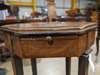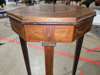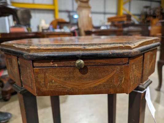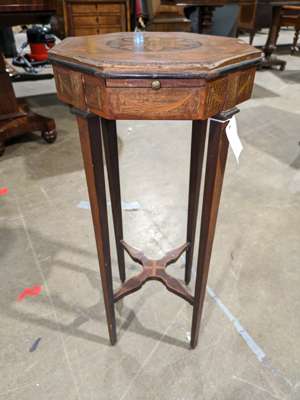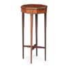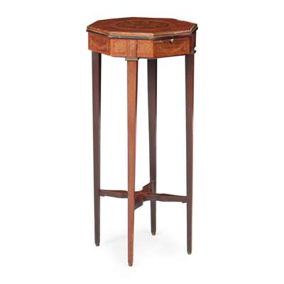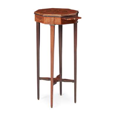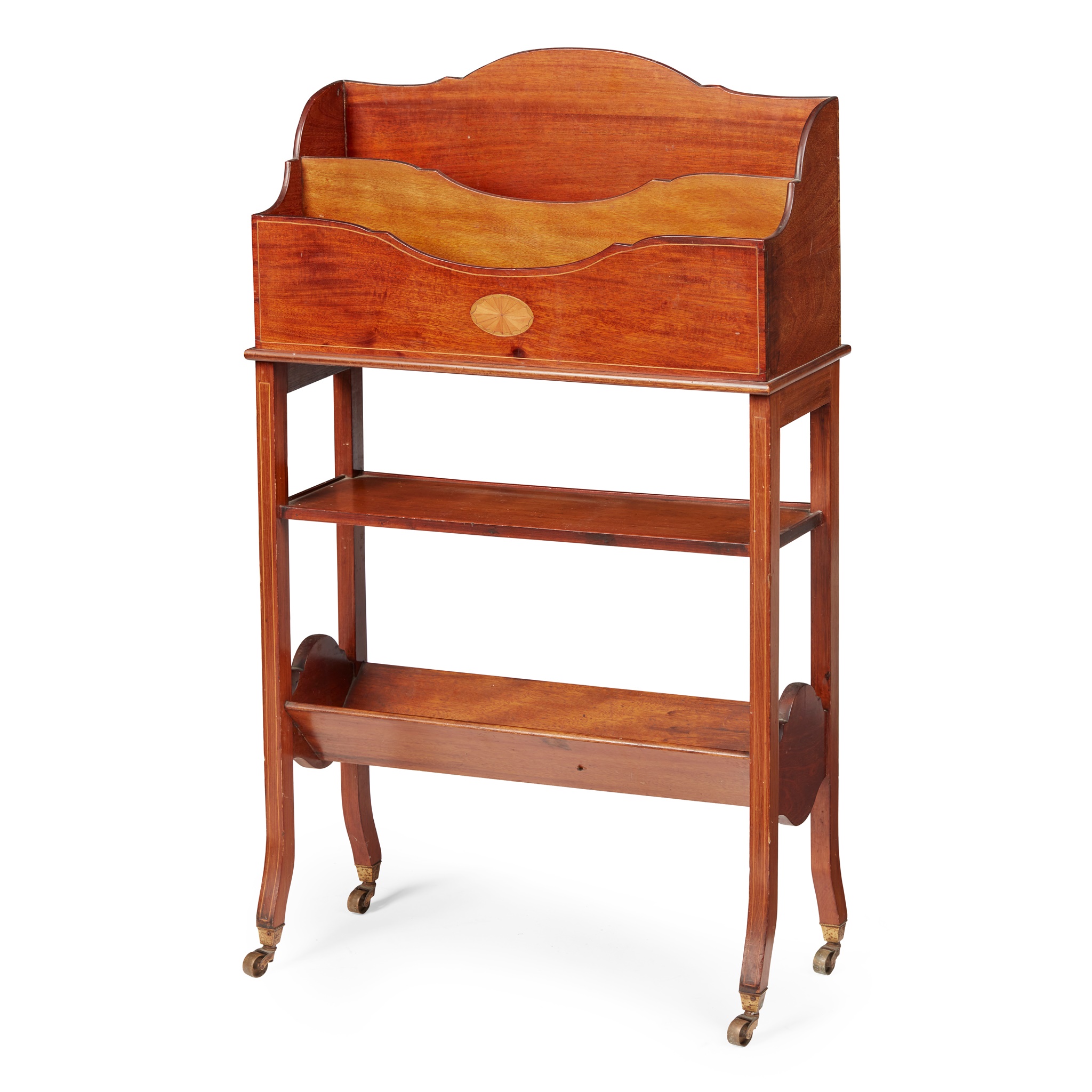 the two division top above an undertier and book trough, raised on square tapered legs ending in brass castors; together with a GEORGIAN STYLE SATINWOOD, HAREWOOD, AND PENWORK URN STAND, late 19th century, in the Sheraton style, the octagonal top with a flower motif inlay above a frieze with swag marquetry and a cup slide, raised on square tapered legs joined by an X stretcher